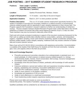 JOB POSTING – 2017 SUMMER STUDENT RESEARCH PROGRAM